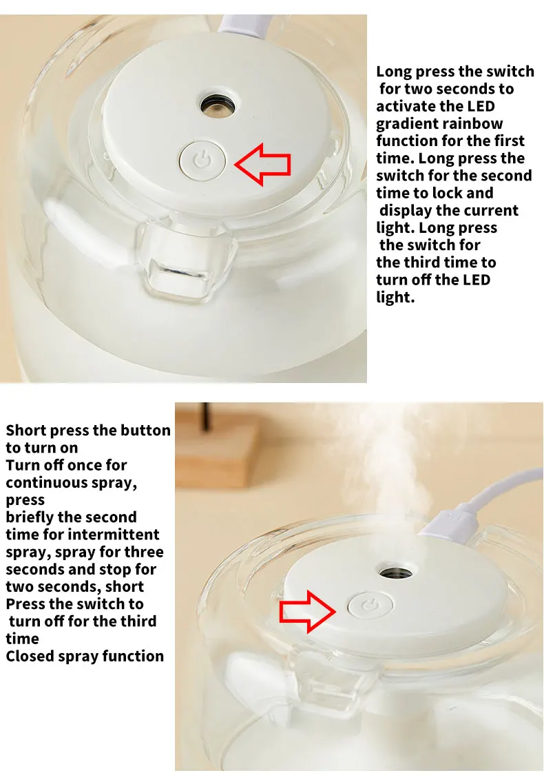 3. Short press the switch to turn on the spray, long press the switch to turn on the night light.