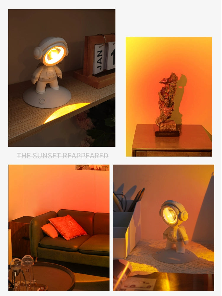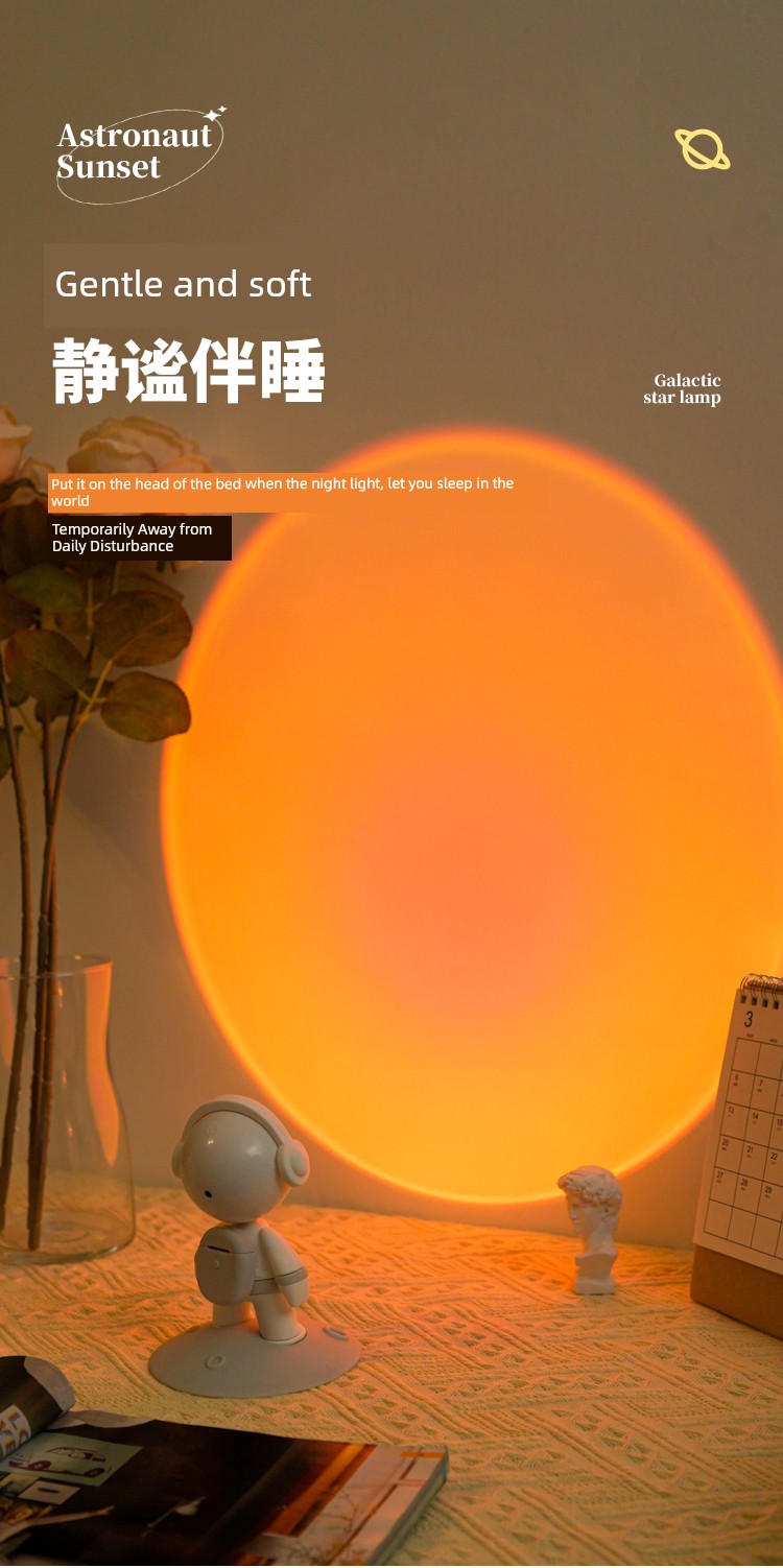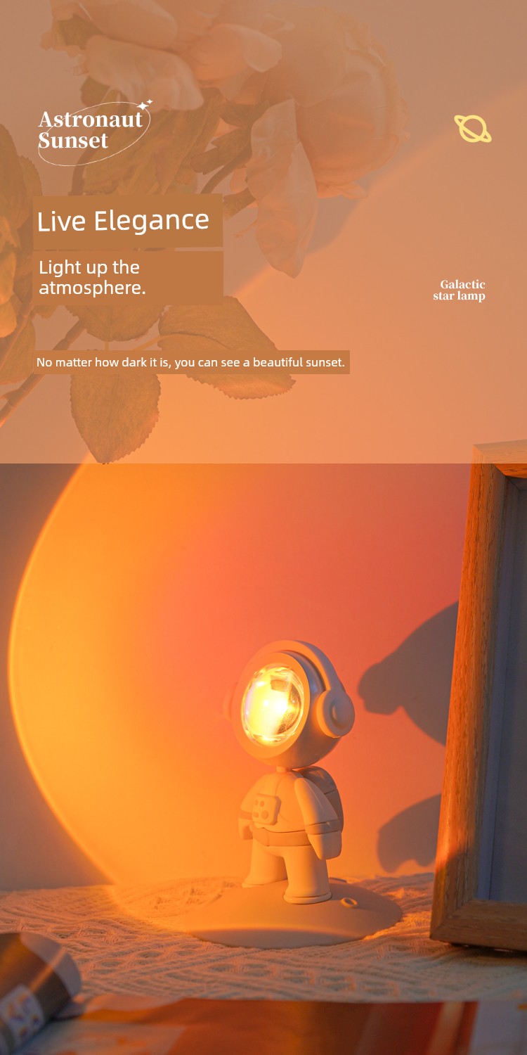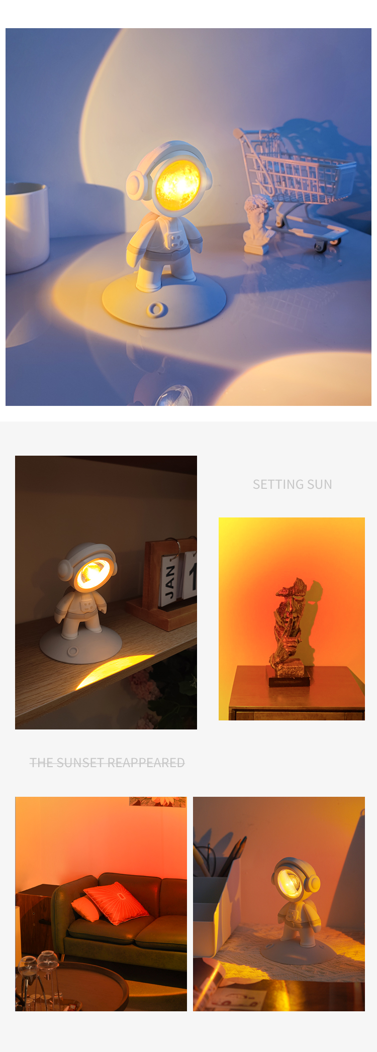 Transform your space with our Astronaut Sunset Night Lamp, creating a mesmerizing sunset projection that soothes your senses and enhances your decor. Why you'll love it: - Unique astronaut design brings whimsy and charm. - Soft, inviting glow promotes relaxation and better sleep. - Ideal for kids and adults, perfect for any room. - Portable design for on-the-go convenience. - An exceptional gift for space lovers or anyone who enjoys ambiance. This premium night lamp features a captivating sunset projection that fills your room with warmth and comfort. Simply plug it in, adjust the angle, and watch as the beautiful sunset light transforms your environment. Use it to wind down your day, create a cozy atmosphere during nighttime activities, or bring a piece of tranquility wherever you go. Get your exclusive Astronaut Sunset Night Lamp today and elevate your home ambiance. Limited time offer!