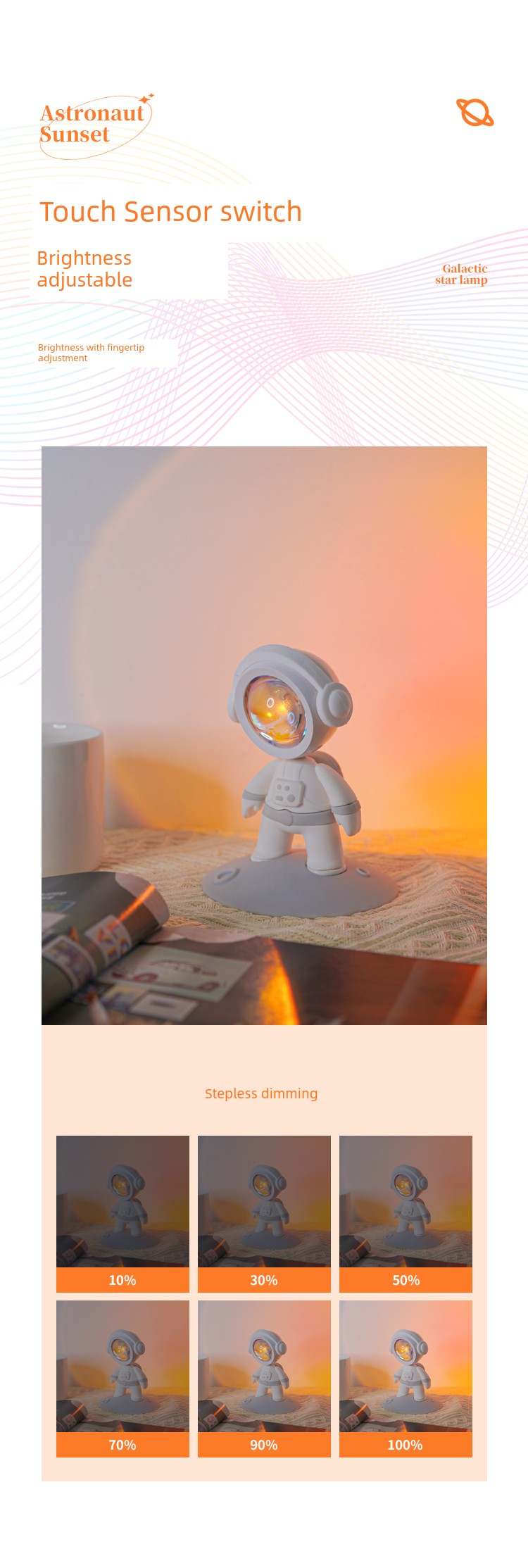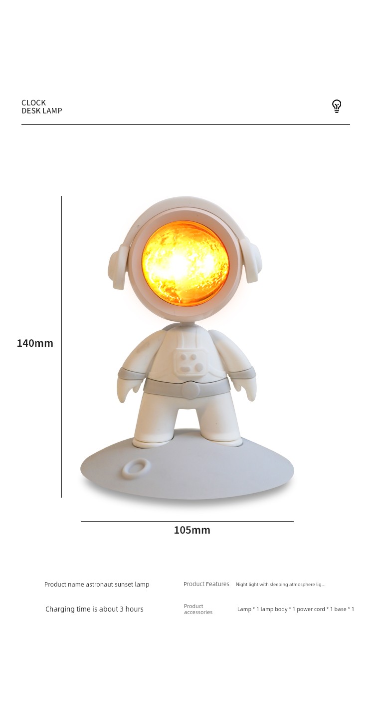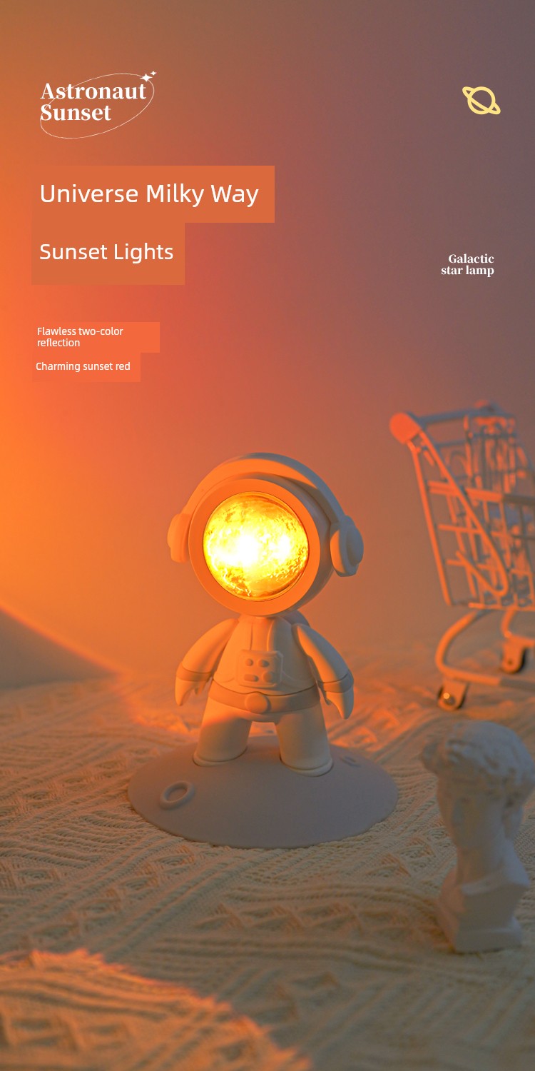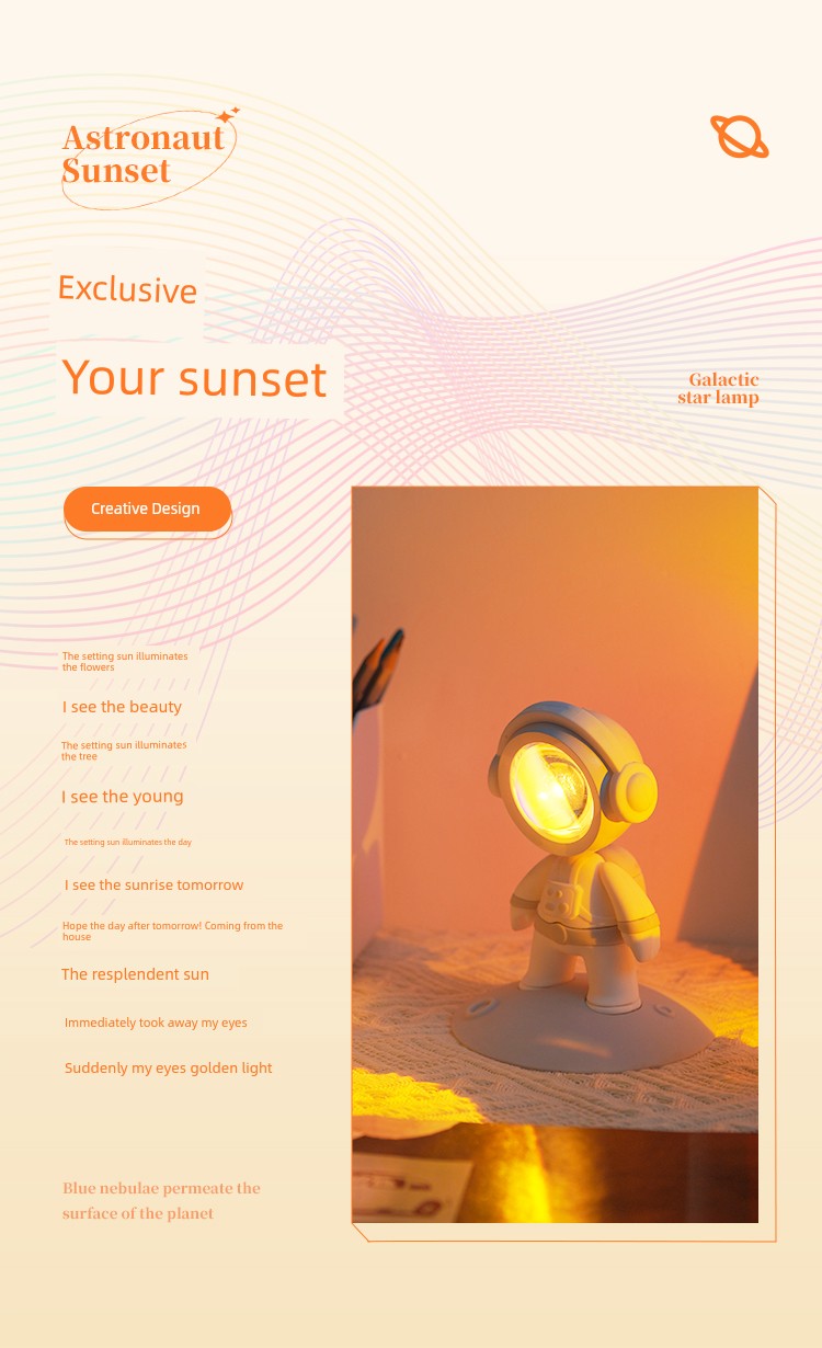 Transform your space with our Astronaut Sunset Night Lamp, creating a mesmerizing sunset projection that soothes your senses and enhances your decor. Why you'll love it: - Unique astronaut design brings whimsy and charm. - Soft, inviting glow promotes relaxation and better sleep. - Ideal for kids and adults, perfect for any room. - Portable design for on-the-go convenience. - An exceptional gift for space lovers or anyone who enjoys ambiance. This premium night lamp features a captivating sunset projection that fills your room with warmth and comfort. Simply plug it in, adjust the angle, and watch as the beautiful sunset light transforms your environment. Use it to wind down your day, create a cozy atmosphere during nighttime activities, or bring a piece of tranquility wherever you go. Get your exclusive Astronaut Sunset Night Lamp today and elevate your home ambiance. Limited time offer!